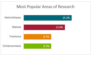 Helminthiasis was a particularly popular research area, making up 15.2% of projects awarded funding. Within this field, projects covered soil-transmitted helminthiasis as well as lymphatic filariasis and river blindness (onchocerciasis).